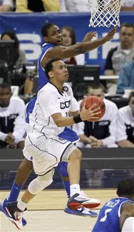 In a tightly contested second half, UConn hung on to beat Kentucky. Kemba Walker led Connecticut with 18 points and 7 assists on a gimpy right ankle. Jeremy Lamb added 12 points and 8 rebounds. Freshman point guard Shabazz Napier played well and made two game clinching free throws with 2 seconds left.