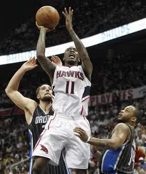 The Atlanta Hawks moved one win away from the second round with victory over the Orlando Magic in game 4. The Hawks built an early lead, and held on for the victory in the fourth. Orlando’s Hedo Turkoglu fumbled the ball on the last possession and missed a game tying attempt up. Jamal Crawford was once again Atlanta’s leading scorer with 25 points. Dwight Howard scored 29 points for the Magic.