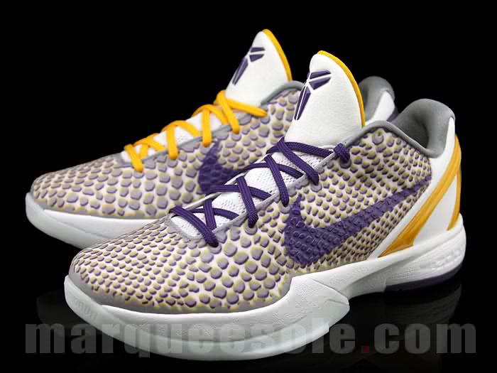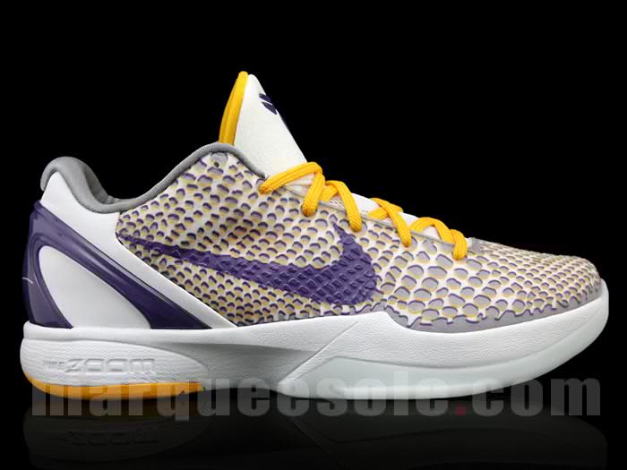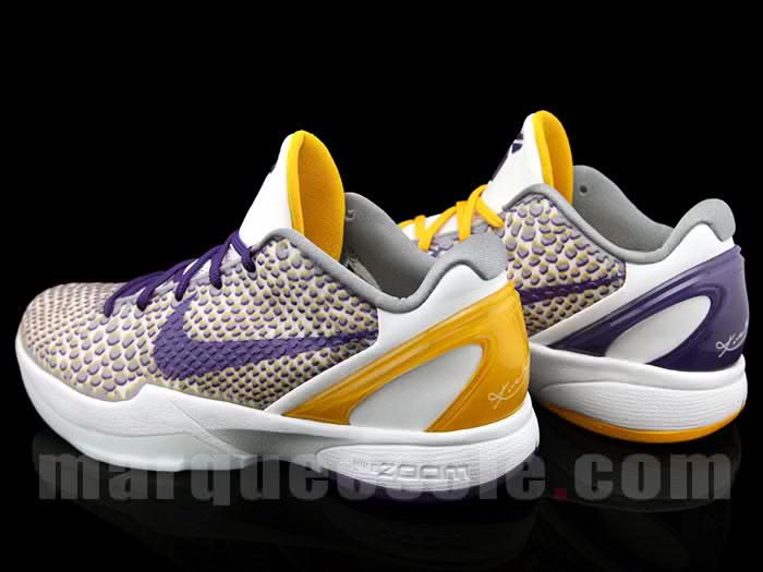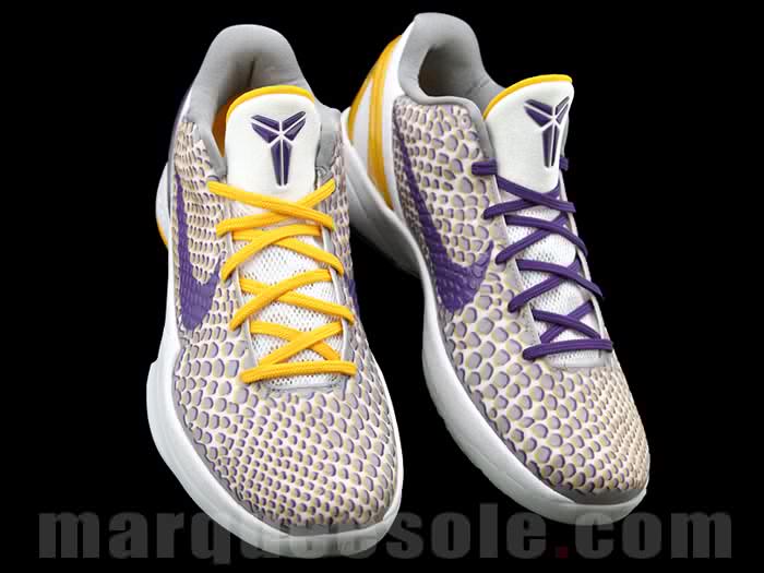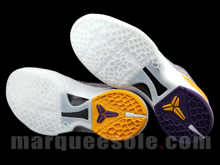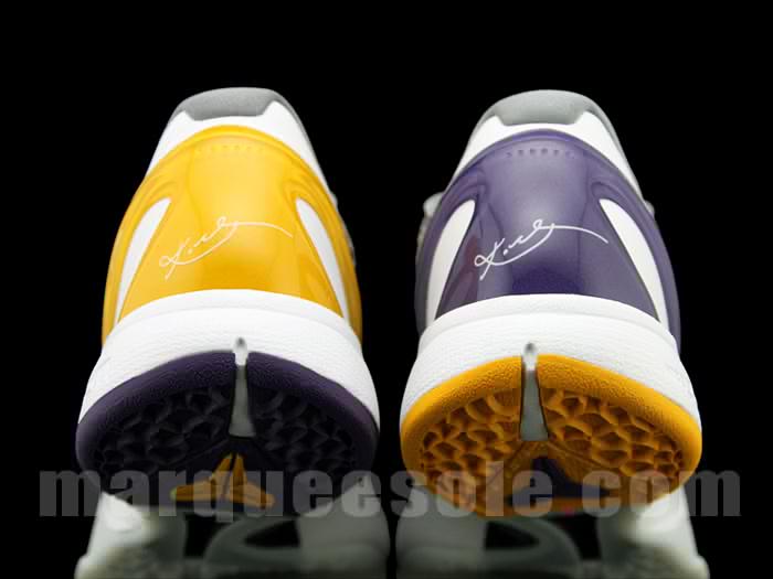 Within the past week several new colorways of the Zoom Kobe VI have popped up. The latest colorway to pop up is the ‘Lakers 3-D’ colorway. Opposites attract in this latest edition to make a very unique shoe. Nike introduced the 3-D element to the Zoom Kobe series with the Zoom Kobe V. 3-D returns with the Zoom Kobe VI. The shoe also uses opposite color schemes for each pair. As you can see in the photos below, one shoe has a yellow heel counter, and laces, while the counter and laces on other shoe is purple. The heel portion of the outsole also incorporates a opposite color scheme. Check out more images via Marqueesole after the jump.