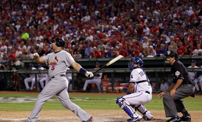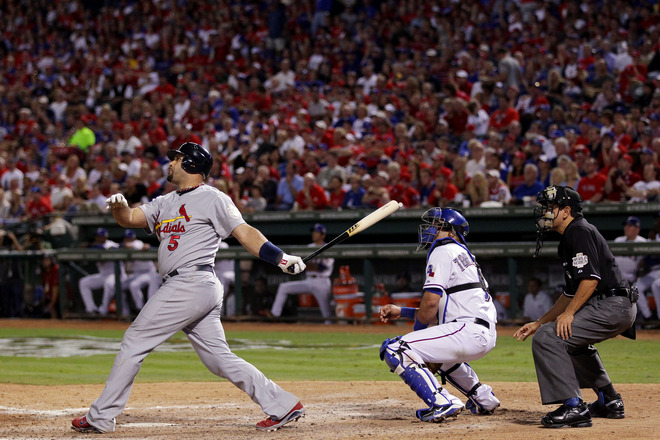 Allen Craig started the action with a solo homer run in the first to give the Cards an early lead. Texas trailed 5-0 heading into the bottom of the 4th but cut the lead to 5-3 on home runs by Michael Young and Nelson Cruz. Texas found themselves down 8-3 in the bottom of the 5th inning but again rallied to make it a 8-6 game. In the following inning the Cardinals scored four runs, including a long 3-run homer by Albert Pujols. Little did anyone know that the Albert Pujols show was just beginning.
