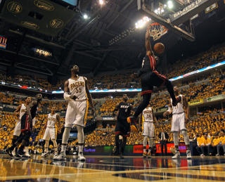 After trailing 2-1 in the series the Heat won three straight behind their superstars Dwyane Wade and LeBron James. Wade was the offensive hero in game 6 as he poured in 41 points, including 26 in the first half. Wade also grabbed 10 rebounds. James had another terrific all-around game with 28 points, 6 rebounds, and 7 assists. David West led the losing Pacers with 24 points.